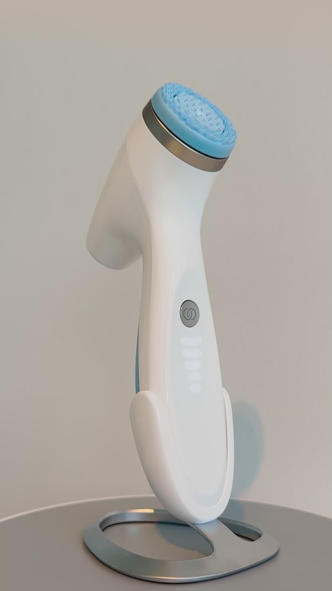 This involves a unique, precise counter-rotating movement of the soft medical grade silicone treatment head. This action is specifically engineered to simultaneously cleanse the skin deeply and provide a skin-perfecting treatment without causing irritation or disrupting the skin's natural microbiome balance.